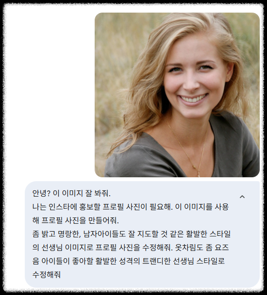 굳이 바쁜 시간 스튜디오에 가지 않아도 원하는 이미지로 만들어 달라고 프롬프팅을 하고