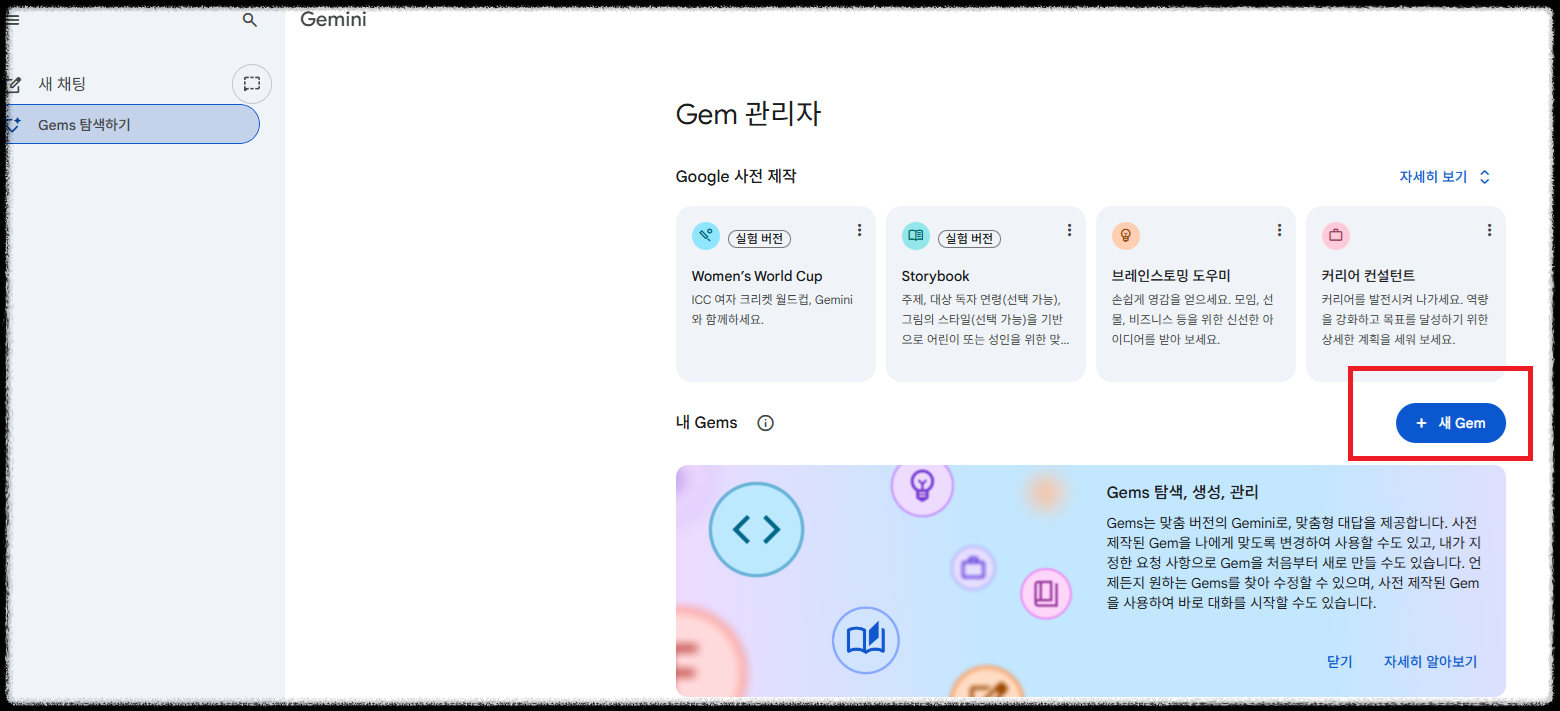 Gems는 구글 Gemini 에서 반복적인 작업을 처리하거나 새로운 분야에 대한 심층적인 전문 지식을 얻는 데 도움이 되는 Gemini의 맞춤형 버전이다(구글 핼프).
